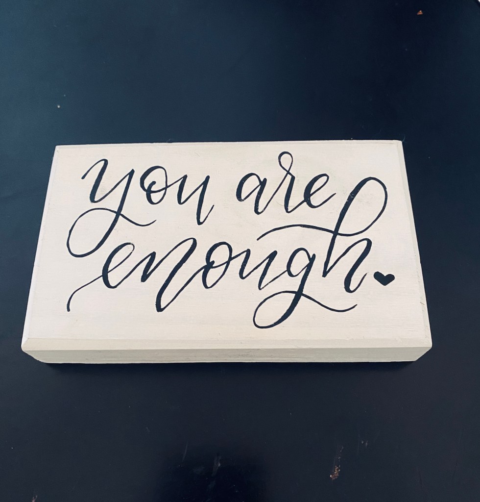 There is this little sign we have on our desk at home. Not too big at all. It’s just the right size. I tried to guess how big, or small it is, but I just used my phone to measure it, because we don’t have a tape measure. Kind of a cool feature to have on a phone. Turns out, this little sign is about 5 1/2″ x 3″ in size. It’s made out of wood, not sure what kind. It isn’t heavy. It’s painted white on the face and sides, but not the back. Not sure why, but I guess it isn’t noticeable, seeing as how I just noticed it isn’t painted back there. It has black lettering on it. Not calligraphy, but some kind of handwriting. All of the letters are lowercased, which probably would have driven my handwriting teachers nuts.